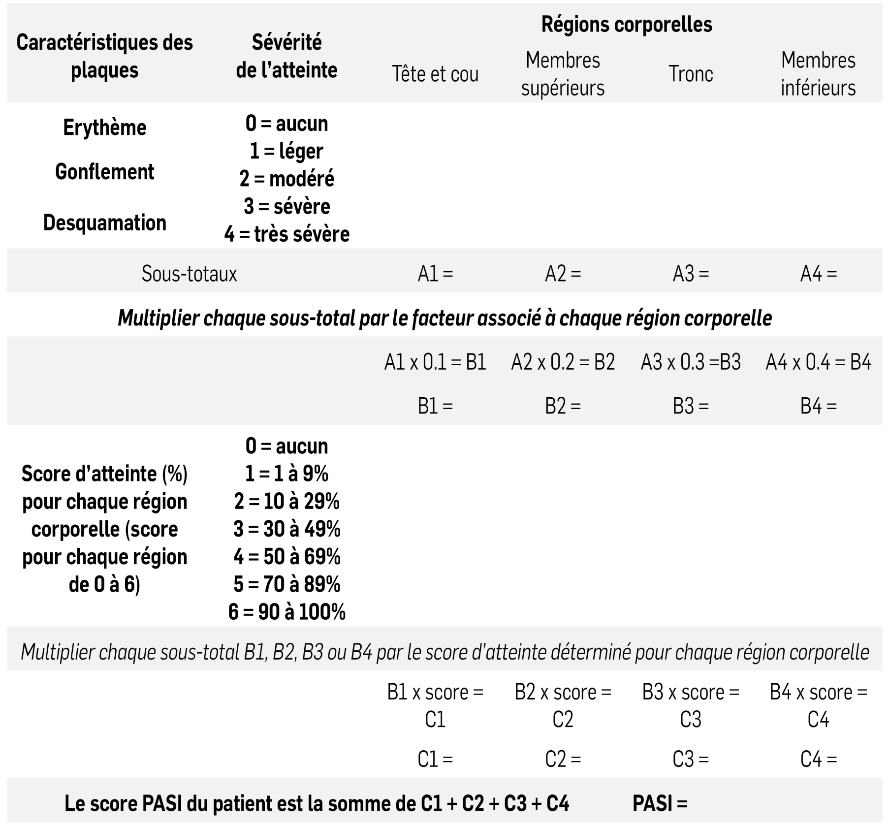 Vous trouverez ci-dessous le formulaire de calcul du score PASI à imprimer, ainsi qu’un calculateur interactif du score PASI. Un autre calculateur interactif vous permettra de déterminer l’évolution du score PASI de vos patients.