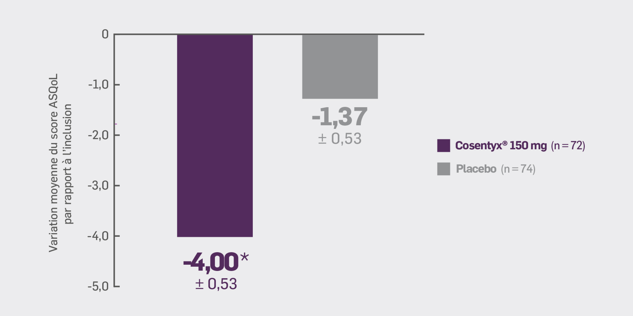 la variation moyenne par rapport à l’inclusion du score ASQoL était de -4,00* (± 0,53)